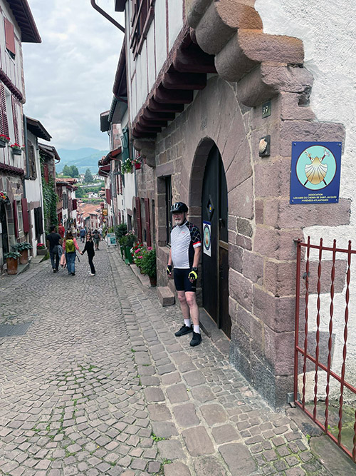 Today has been the toughest day yet. The incline on some of the climbs led us to get off and push. We get there in the end! The roads are quiet and the views amazing, so green and lush. We aimed to get to the start of the Camino by 12 noon and were only 15 minutes off that. We got our first Passport stamp in Saint Jean Pied de Port.