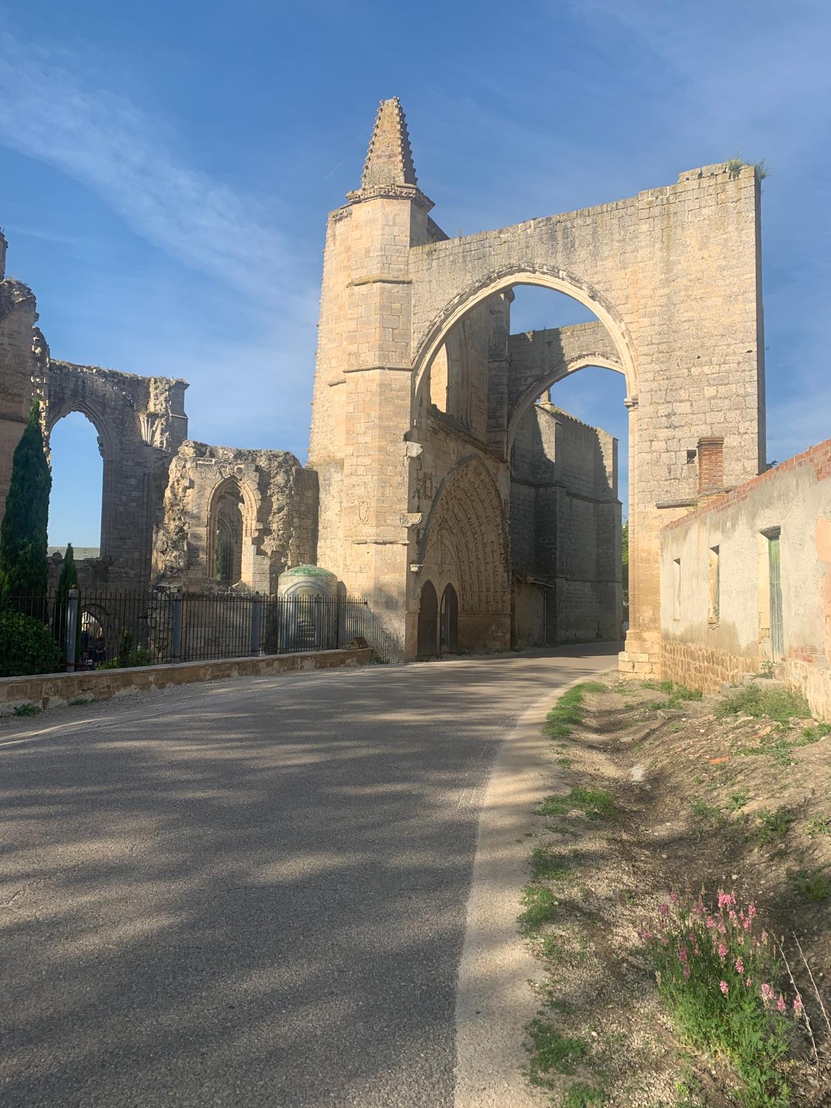 We set off at 6.30 this morning, and it was beautiful with the moon still in the sky and the sun yet to rise. This was going to be a relatively flat day so we could hopefully bump up our daily mileage. It was a great ride with many gradual downhills allowing us to freewheel a few miles. We passed through the arch of an old abbey before reaching Castrojeriz for breakfast with about 25 miles under our belt …the garden café had a sign saying bacon, egg and coffee, the best marketing tool for hungry pilgrims – delicious.