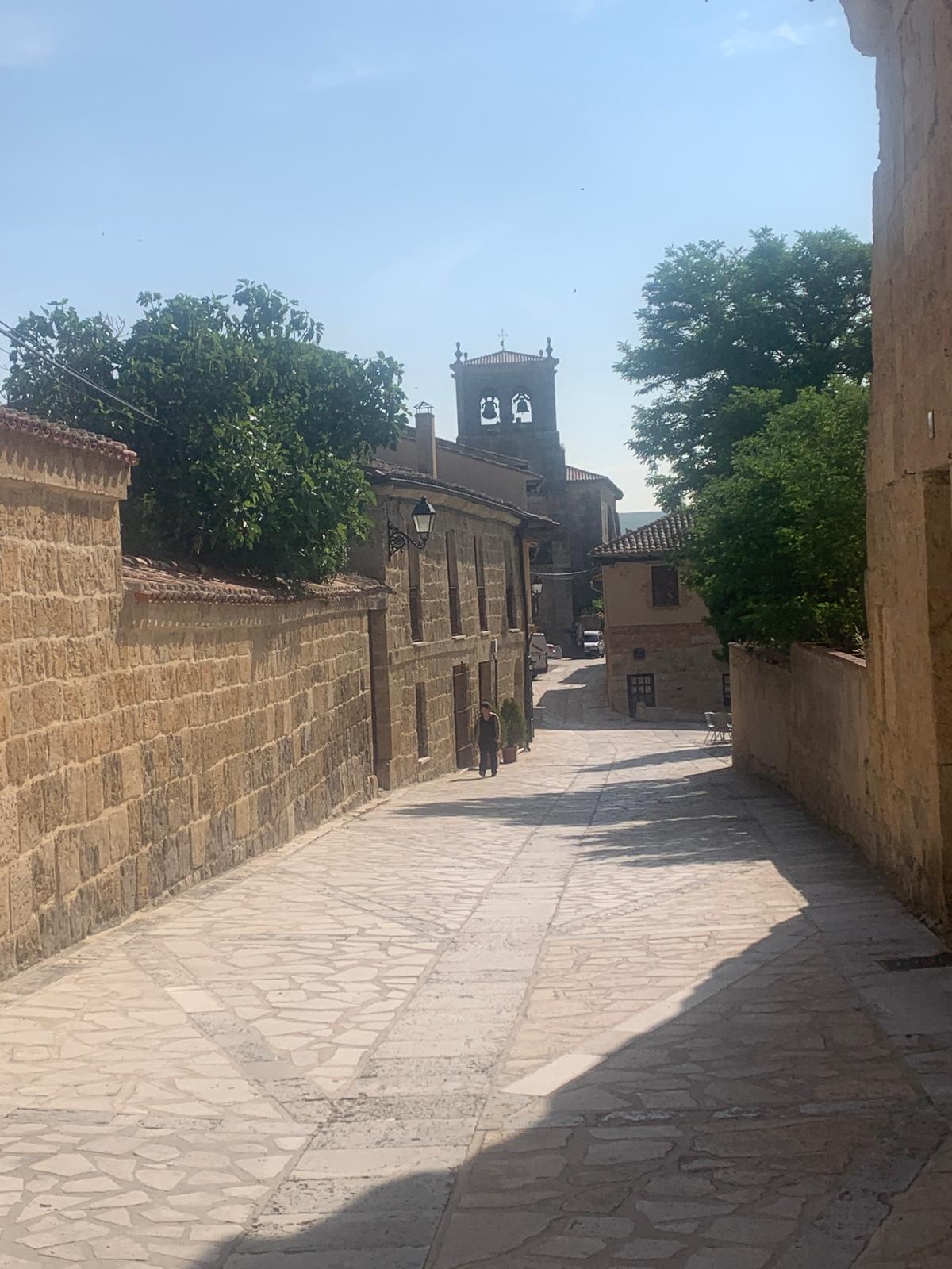 Today has been the hottest day of the ride, 32 degrees at its peak. Our aim is to get all our cycling done between 12noon and 1pm when it would be 27 degrees…for me after that it becomes dangerous. So we’ve reduced our daily target. As we wound out the streets of Pamplona at 7 am there were a lot of Pilgrims walking.  There were still some v tough climbs, which we took our time on. We went through the town of Estella around noon teaching our stopping point of Los Arcos. The Way has great (and good value) Albergues were we are staying. We still managed about 45 miles.